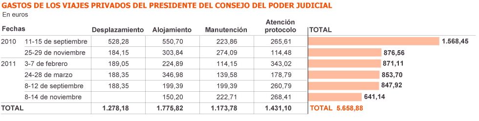 No obstant això, un treball d'investigació magnific, realitzat pel diari "El País", curiosament, no ho va esbrinar la fiscalía, el magistrat carregà despeses de menjars i hotels de luxe, no més de 4 esteles, segons afirmaria el llastimós Dívar, en els 32 viatges de cap de setmana, llargs, dels quals 20 foren a Marbella i tots ells per un total 20.160,28 €, que segons la normativa interna del CGPJ no tenia que justificar.